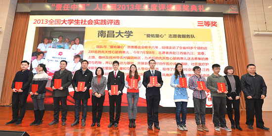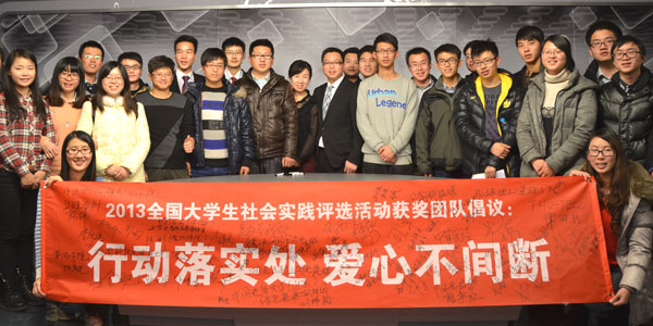 人民網(wǎng)北京1月15日電 (記者 張葳)1月15日,2013全國大學(xué)生社會(huì)實(shí)踐評(píng)選活動(dòng)舉行頒獎(jiǎng)和座談活動(dòng),獲獎(jiǎng)大學(xué)生代表上百個(gè)團(tuán)隊(duì)發(fā)表了倡議書,號(hào)召全國大學(xué)生們?cè)谏鐣?huì)實(shí)踐中做到“行動(dòng)落實(shí)處,愛心不間斷”,經(jīng)常性、持續(xù)性地走進(jìn)社會(huì)、服務(wù)基層,拒絕形式主義。