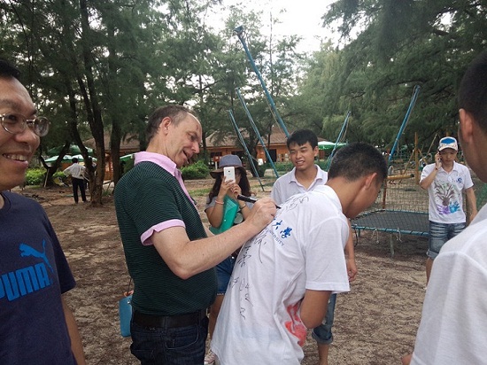 外國(guó)友人表示愿意參加到保護(hù)紅樹林的行動(dòng)中來(lái),在隊(duì)服上簽上自己的名字
