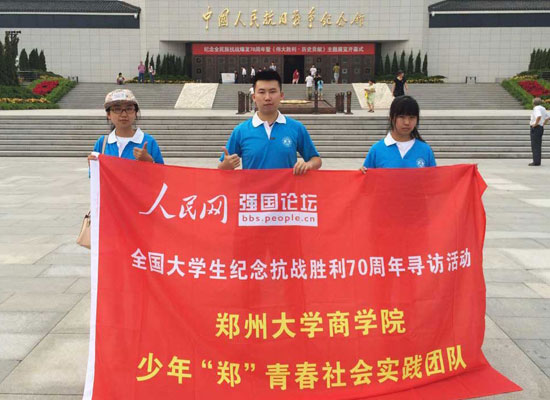 7月16日,鄭州大學“少年鄭青春”暑期實踐隊,開展了“緬懷革命先烈,樹立信心實現(xiàn)中國夢”實踐活動。團隊通過抗戰(zhàn)知識調(diào)研、參觀抗戰(zhàn)紀念館、采訪抗戰(zhàn)老兵、向幼兒園孩子普及抗戰(zhàn)知識等方式紀念抗戰(zhàn)勝利70周年。