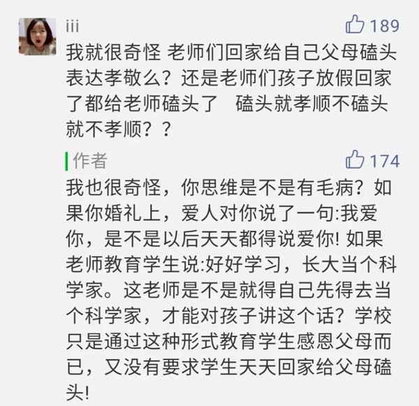 網友“兩點半加雞蛋小王子”:下跪磕頭代表的意義是服從,就是要求孩子乖乖聽話,不可忤逆,暗示孩子你們只是父母的一件所有物,抹殺了獨立人格的存在。