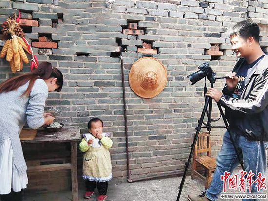 高玉樓從公司白領(lǐng)回到麗江榮將鎮(zhèn)創(chuàng)業(yè)賣芒果,為家人拍攝視頻。(中國(guó)青年報(bào))