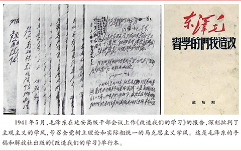 延安整風(fēng)運動以反對主觀主義、宗派主義、黨八股,樹立馬克思主義作風(fēng)為主要內(nèi)容。而鑒于深重的思想之弊和慘痛的實踐教訓(xùn),反對主觀主義以整頓學(xué)風(fēng),成為開展整風(fēng)運動的關(guān)鍵。整風(fēng)運動開展后,毛澤東就緊緊抓住思想方法和作風(fēng)問題不放。他在給中央研究組同志的信中指出:學(xué)習(xí)理論要“以研究思想方法論為主”。破除錯誤的思想方法,暢行正確的思想作風(fēng),最重要的就是要遵循實事求是的思想路線,做到理論聯(lián)系實際!皩嵤虑笫恰边@個詞,并非毛澤東首創(chuàng),但把“實事求是”上升到黨的思想路線的高度,則是毛澤東的功勞。毛澤東強調(diào),“要分清創(chuàng)造性的馬克思主義和教條式的馬克思主義”,“宣傳創(chuàng)造性的馬克思主義”,“使中國革命豐富的實際馬克思主義化”。不能從理論上來思考中國革命實踐的人,是不能妄稱為馬克思主義理論家的。只有從客觀實際中概括出而又在客觀實際中得到證明的理論,才稱得起我們所講的理論。
