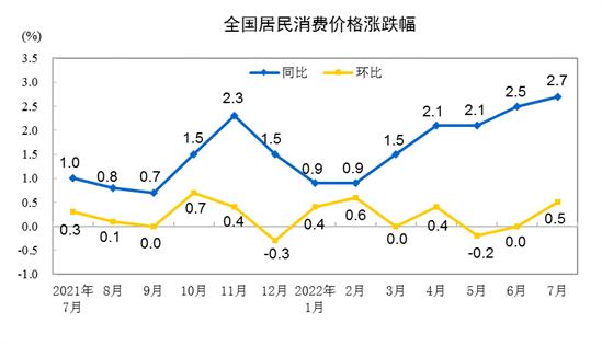 7月份,CPI環(huán)比上漲0.5%,同比漲幅略有擴(kuò)大,上漲 2.7%。