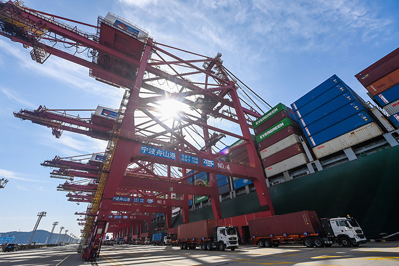 集裝箱卡車在寧波舟山港金塘港區(qū)大浦口集裝箱碼頭裝載集裝箱。新華社記者 徐昱 攝